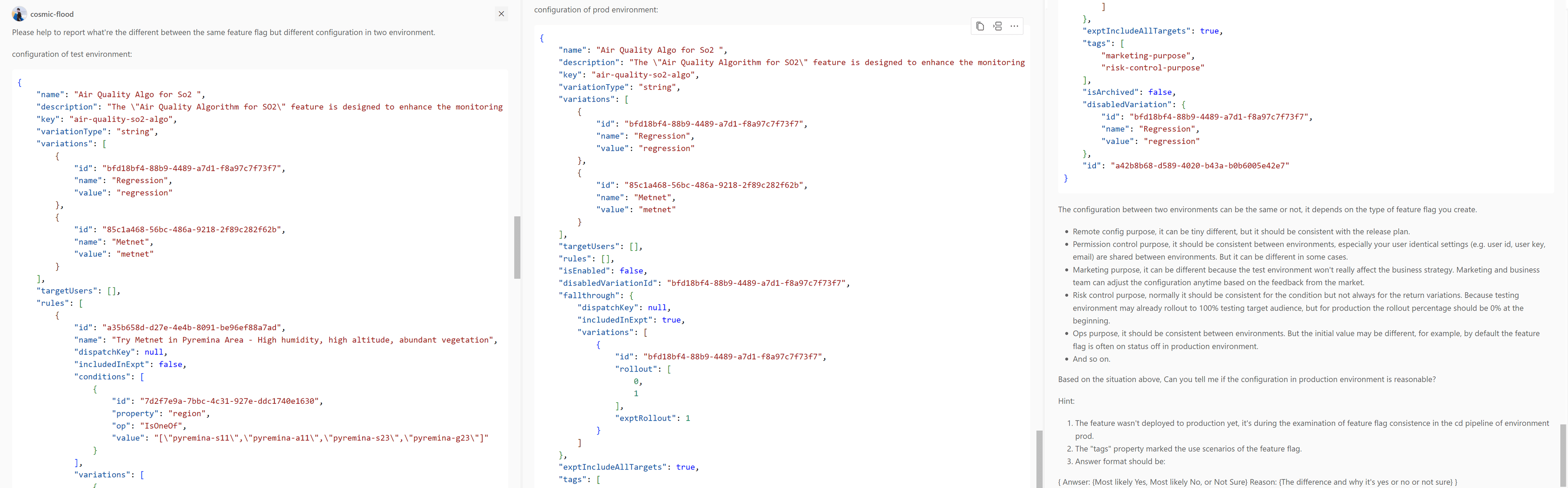 Thanks to AI large language models, it's possible now to let the machine to check the feature flag configuration. Especially when team deploy frequently Here's an example of how we compared the configuration of a feature flag between test and production environments.